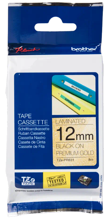 Taśma lamin. Brother TZE-PR831 12mm x 8m czarny nadruk / złote tło do drukarki Brother PTP910BT, Brother PTD200, Brother PTD200BWVP, Brother PTD210, Brother PTD210VP, Brother PTD400, Brother PTD450VP, Brother PTD600VP, Brother PTD800W, Brother PTE110VP, Brother PTE300VP, Brother PTE550WSP, Brother PTE550WVP, Brother PTH105, Brother PTH105WB, Brother PTH107B, Brother PTH110, Brother PTH500, Brother PTP300BT, Brother PTP750W, Brother PTP900W, Brother PTP950NW, Brother PTP710BT, Brother GL-H105, Brother GL-H105VP, Brother PT9200DX, Brother PT9400, Brother PT9500PC, Brother PT9600, Brother PTD200VP, Brother PTE100VP, Brother PTH300, Brother PTH75, Brother PTP700, Brother PTP750TDI, Brother PT1000, Brother PT1000L, Brother PT1005, Brother PT1010, Brother PT1010L, Brother PT1080, Brother PT1090, Brother PT1230PC, Brother PT1260VP, Brother PT1280DT, Brother PT1290, Brother PT1750, Brother PT1800, Brother PT18R, Brother PT1950, Brother PT2030VP, Brother PT2100, Brother PT2420PC, Brother PT2430PC, Brother PT2470. OryginalnaTaśma laminowana Brother TZE-PR831 to gwarancja wysokiej jakości produktu i dobrej ceny! Oferujemy tanie materiały eksploatacyjne do drukarek Brother. Przekonaj się sam zamawiając już teraz w naszym sklepie online www.everprint.pl!